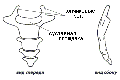 Рис 2.24. Крестец Верхняя, широкая часть крестца называется его основанием. На его верхней поверхности находится округлое углубление, куда примыкает своей нижней поверхностью тело 5-го поясничного позвонка. С суставными отростками этого же позвонка соприкасаются отходящие от основания вверх и развернутые суставными поверхностями навстречу друг другу и немного назад верхние суставные отростки крестца, а точнее - первого крестцового позвонка. На верхней части боковой поверхности крестца располагается обширная суставная ушковидная поверхность, сочленяющаяся с тазовой костью. Нижняя часть крестца называется его вершиной. Ее нижняя поверхность несет на себе маленькую плоскую площадку, граничащую с копчиком. Чуть выше располагаются небольшие направленные вниз отростки - крестцовые рога. Между боковой поверхностью крестца и медиальным краем седалищного бугра натянута мощная и широкая крестцово-бугорная связка, к которой прикрепляется большая ягодичная мышца. Копчик, os coccygis (рис. 2.25), представляет собой небольшую кость, обращенную своим заостренным концом вниз-вперед и завершающую позвоночный столб, располагаясь непосредственно под крестцом. На верхней части копчика имеются два направленные вверх отростка - копчиковые рога, соединяющиеся своими верхними концами с крестцовыми рогами. Между основаниями копчиковых рогов находится слегка вогнутая площадка - поверхность, образующая вместе с обращенной к ней площадкой вершины крестца крестцово-копчиковое соединение.
