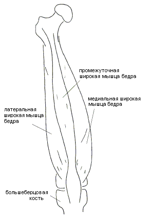 Рис 2.27. Четырехгалавая мышца бедра. Вид спереди (прямая мышца бедра не изображена) Мышца состоит из четырех головок, соединяющихся в своей дистальной части в широкое сухожилие, проходящее над надколенником и сращенное с ним, и прикрепляющееся к бугристости большеберцовой кости. Эти головки имеют самостоятельные названия: прямая мышца бедра и медиальная, промежуточная и латеральная широкие мышцы бедра. Функция: разгибает коленный сустав и сгибает бедро, выводя его вперед. Прямая мышца бедра, m. rectus femoris (рис. 2.28), представляет собой длинное брюшко, идущее вдоль передней поверхности бедра. Ближе к надколеннику, на расстоянии, приблизительно равном его удвоенной длине, превращается в сухожилие, идущее дистально, поверх надколенника срастаясь с ним, и прикрепляясь к бугристости большеберцовой кости. Ближе к проксимальному концу брюшко сужается, превращаясь в сухожилие, которое делится на две ножки: первая прикрепляется к нижней передней подвздошной ости, вторая - над вертлужной впадиной.