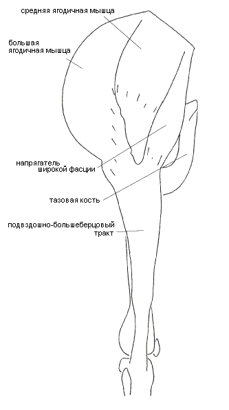 Рис 2.35. Мышцы правого бедра. Вид с латеральной стороны Функция: отводит бедро латерально-вперед. Средняя ягодичная мышца, m. gluteus medius (рис. 2.35), располагается на латеральной стороне таза между напрягателем широкой фасции и большой ягодичной (частично под ней). Мышца в своей дистальной части прикрепляется коротким мощным сухожилием к проксимальной поверхности большого вертела. Сухожилие превращается в мышечные волокна, расходящиеся веерообразно и прикрепляющиеся к обширной области в верхней части наружной поверхности крыла подвздошной кости. Спереди мышца граничит с напрягателем широкой фасции, сзади частично накрывается большой ягодичной. Функция: отводит бедро в латеральную сторону. Идентификация. Дистальная граница большой ягодичной мышцы на задней поверхности бедра достаточно четко обозначена выпуклым рельефом ягодицы, образующей в соответствующем месте ягодичную складку, идущую немного косо поперек бедра. Для того, чтобы идентифицировать латеральный край большой ягодичной мышцы, нужно попросить стоящего на одной ноге клиента поднять другую в сторону и назад - при этом мышца напрягается и ее контур обрисовывается в целом. Латеральный край мышцы проходит по большому вертелу бедра, накрывая его, и при некотором навыке легко прощупывается даже в расслабленном состоянии всех мышц бедра, это относится и к довольно плотному апоневрозу - подвздошно-большеберцовому тракту, идущему вдоль латеральной поверхности бедра. Если попросить клиента поднять ногу вперед-в сторону, то контурируется и легко прощупывается брюшко и проксимальное сухожилие напрягателя широкой фасции вплоть до его прикрепления к гребню подвздошной кости чуть назад и латерально от передней верхней подвздошной ости. Если попросить клиента отвести ногу точно в латеральную сторону, то напрягается и легко прощупывается средняя ягодичная мышца (она не столь рельефна, как ее соседи), и теперь нетрудно прощупать ее границы с напрягателем широкой фасции и большой ягодичной. Маргинальная зона разветвления подвздошно-большеберцового тракта на переднюю и заднюю части, превращающиеся соответственно в напрягатель широкой фасции и большую ягодичную мышцу, находится чуть дистальнее и спереди от большого вертела и тоже при некотором навыке без труда определяется. Массаж большой ягодичной мышцы начинается с мест ее прикрепления к боковым поверхностям крестца и копчика. Далее массируем, идя фронтальным Гребешком (или двумя сразу, один рядом с другим) вдоль мышечных волокон в латерально-дистальном направлении от крестца и задней верхней подвздошной ости вплоть до подвздошно-большеберцового тракта. Последний по всей длине проскребываем ногтями (см. массаж длинной ладонной мышцы), а место прикрепления к большеберцовой кости массируем двойным перекатом Ковшиком. Промассировав поперечными Гребешками достаточно глубокие "канавки" под задний и латеральный края мышцы, эфирно соединяем их под внутренней поверхностью мышцы, как бы отделив ее от туловища. Напрягатель широкой фасции массируем в месте прикрепления к подвздошному гребню двойным перекатом Стрелой, а затем вдоль волокон эллиптическим массажем фронтальным Гребешком, уделяя особое внимание маргинальной зоне перехода мышечных волокон в сухожилие у дистальной части мышцы, то есть у ее перехода в подв