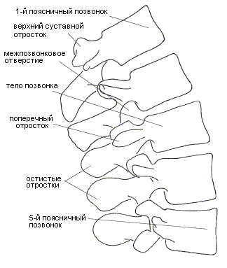 Поясничные позвонки, vertebrae lumbalis (рис. 3.1), числом пять, самые массивные во всем позвоночном столбе. Однако на поверхность тела они, как и грудные, выходят лишь задними концами своих остистых отростков. Тем не менее для эффективного массажа полезно знать строение и той части позвонков, которая недоступна для пальпирования.