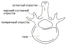Рис 3.2. 1-й и 2-й поясничные позвонки. Вид сзади Между суставным отростком и телом позвонка находится позвоночная вырезка, верхняя или нижняя (рис. 3.3) - в соответствии с типом отростка. Позвоночные вырезки соседних позвонков ограничивают межпозвоночное отверстие, через которое проходят нервы и кровеносные сосуды спинного мозга. Между телами соседних позвонков располагается упругий межпозвоночный диск (хрящ), чьи краниальная и каудальная поверхности сращены с соответствующими поверхностями тел этих позвонков. Межпозвоночные диски сравнительно толсты, составляя в совокупности около четверти всей длины позвоночного столба.