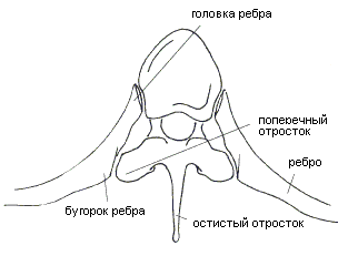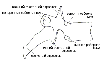 Рис 3.5. и 3.6 Позвоночник. Вид сзади и вид сбоку Третье существенное отличие заключается в расположении суставных поверхностей суставных отростков. Эти поверхности у грудных позвонков расположены приблизительно во фронтальной плоскости и направлены назад и чуть краниально у верхних отростков и вперед и чуть каудально у нижних (исключая 12-й позвонок, чьи суставные поверхности на нижних суставных отростках направлены латерально, то есть как у поясничных позвонков). Тела у грудных позвонков менее массивны, чем у поясничных, причем их высота убывает вместе с номером позвонка. Поперечные отростки грудных позвонков короче, чем у поясничных, и направлены не строго латерально, а еще и несколько назад. На задне-латеральной стороне поперечного отростка ближе к его концу расположено небольшое углубление - поперечная реберная ямка, сочленяющаяся с бугорком ребра, которое прикрепляется к данному позвонку. На задне-латеральной части тела позвонка располагаются две небольшие ямки: одна на краниальном крае тела, другая на каудальном - это соответственно верхняя и нижняя реберные ямки. Нижняя ямка данного позвонка вместе с верхней ямкой нижележащего образует углубление, в которое входит головка ребра, образуя сустав головки ребра. На 1-м, 11-м и 12-м позвонках имеется с каждой стороны всего по одной реберной ямке, расположенной между его краниальным и каудальным краями (рис. 3.7 и 3.8).