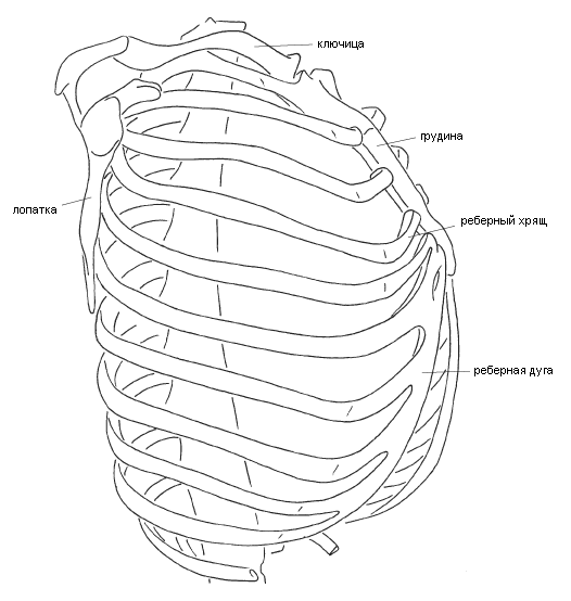 Рис 3.12 Грудная клетка. Вид справа Идентификация. Изучая ребра, следует обратить внимание на то, что они расположены довольно косо, то есть не лежат в горизонтальной плоскости, а идут от своего позвоночного конца не только латерально, но и каудально и лишь после превращения в хрящ получают краниальное направление (исключая 1-е и 2-е ребра, чьи хрящи входят в грудину, сохраняя небольшой каудальный склон, характерный для этих ребер на всем их протяжении). На спине при некотором навыке, который лучше нарабатывать на худых клиентах, легко идентифицируются углы нижних ребер (кроме 12-го, на котором угла нет). Углы верхних ребер находятся чуть медиальнее медиального края лопатки (при опущенной вниз руке ее нижний угол опускается чуть ниже тела 8-го ребра) и прощупываются с некоторым трудом, так как прикрыты толстым слоем мышц (чем краниальнее, тем толще), тем не менее иногда удается прощупать даже угол 2-го ребра. У 11-го и 12-го ребер нетрудно прощупать концы, если приблизительно определить их местоположение и двигаться к концу 12-го ребра с каудально-латеральной стороны и спереди к 11-у. Если углы ребер не очень рельефны, при их идентификации помогает то, что к ним прикрепляются идущие каудально сухожилия мышц, которые достаточно отчетливо пальпируются. На боковой поверхности туловища тела ребер прощупываются отчетливо, однако медиальнее углов ребра уходят под мощные мышцы, сквозь которые прощупываются уже гораздо хуже, а вблизи позвоночника совсем уходят в глубь тела под поперечные отростки грудных позвонков и становятся недоступными для пальпации. Межреберные промежутки пальпируются (у худого клиента) отчетливо почти везде. На передней поверхности грудной клетки лежит граница между костной частью ребра и его хрящом. Эту границу приблизительно можно идентифицировать чисто геометрически: все такие границы (исключая 1-е ребро) лежат на одной прямой, идущей от латерального края рукоятки грудины в каудально-латеральном направлении до нижнего края реберной дуги, составленной из краниальных концов хрящей 7-го, 8-го, 9-го и 10-го ребер. Более точно определить точку перехода костной части ребра в хрящ помогает разница в их тактильном ощущении - хрящ более мягок и упруг, а также характерная небольшая ямка на месте перехода. Верхние ребра с трудом прощупываются в своей передне-латеральной и латеральной части, где они прикрыты толстыми мышцами, а у женщин еще и молочными железами, которые мы обходим стороной. Зато все хитросплетение хрящей ложных ребер прощупывается сравнительно легко, если только клиент здесь не испытывает сильной щекотки, впрочем, с ней иногда помогает справиться неподвижное наложение рук массажиста, сопровождающееся мысленной инициацией нисходящего потока. Через некоторое время ребра сильно разогреваются, привыкают к рукам массажиста и перестают им сопротивляться: щекотка есть не что иное, как форма сопротивления организма внешнему воздействию. Первое ребро прощупывается у своего грудинного конца сразу под ключицей; направляясь латерально, оно быстро скрывается под ней; второе ребро идет ниже и скрывается под ключицей вблизи клювовидного отростка лопатки - далее прощупать его не удается. Впрочем, на последнем автор не настаивает - опытный массажист может прощупать очень многое, однако в данной книге речь идет скорее о нач
