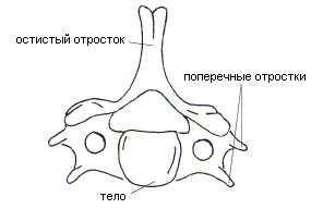 Рис 4.2. 5-й шейный позвонок. Вид сверху Верхние суставные отростки несут плоские суставные площадки, направленные назад-краниально, нижние - площадки, направленные вперед-каудально. 7-й шейный позвонок имеет особенно длинный и нераздвоенный остистый отросток, поэтому этот позвонок называют выступающим.