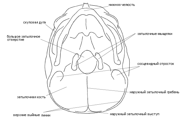Рис 4.6. Кости черепа. Вид сзади и сверху Височная кость, os temporalis, расположена в черепе с нижне-латеральной стороны. Ближе к ее нижнему краю находится наружное слуховое отверстие, вокруг которого располагается ухо. Сзади от этого отверстия находится сосцевидный отросток, нижняя часть которого отчетливо прощупывается под кожей сразу сзади от мочки уха. Задняя часть сосцевидного отростка зазубренным затылочно-сосцевидным швом соединяется с затылочной костью. На уровне верхнего конца этого шва в височной кости находится теменная вырезка, в которую входит задне-нижний угол соответствующей кости. Верхняя часть кости называется чешуей, ее ограничивает полукруглый край - граница с теменной костью (верхне-задняя часть края, соответствующая чешуйчатому шву) и клиновидной костью (передняя часть края, соответствующая клиновидно-чешуйчатому шву). Вниз-вперед от височной кости идет длинный и узкий шиловидный отросток, идущий горизонтально вперед к скуловой кости, образуя с ней височно-скуловой шов и представляющий собой заднюю часть скуловой дуги, - она легко прощупывается через кожу как нижняя граница височной ямки. Под задним концом скулового отростка находится нижнечелюстная ямка овальной формы, сочленяющаяся с головкой нижней челюсти.