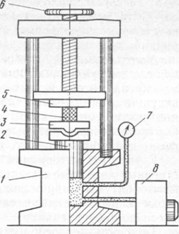 где F — разрушающая сила, Н; А — площадь поперечного сечения образца до испытания, м2. Предел прочности при сжатии различных материалов 0,5... 1000 МПа и более. Прочность на сжатие определяют испытанием образцов на механических или гидравлических прессах. Для этой цели применяют специально изготовленные образцы, формы куба со стороной 2...30 см. Из более однородных материалов образцы делают меньших размеров, а из менее однородных — больших размеров. Иногда на сжатие испытывают образцы, имеющие форму цилиндров или призм. При испытании на растяжение металлов применяют образцы в виде круглых стержней или полос; при испытании на растяжение вяжущих веществ используют образцы в виде восьмерок.