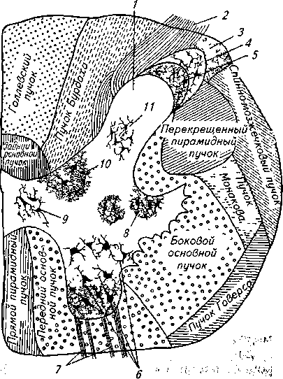 f.ii'i Спинной мозг — один из отделов центральной нервной системы, координирует работу всех скелетных мышц туловища и конечностей, в нем сосредоточены центры безусловных рефлексов, которые осуществляются автоматически, бессознательно, например движение хвоста, подкожных мышц при раздражении кожного покрова насекомыми, отдергивание при болевых физических воздействиях на отдельные участки тела животного и др. Спинной мозг развивается из эктобласта; последовательно образуются нервная трубка, нервный желобок с ганглиозной пластинкой, нервная трубка, из которой формируется серое мозговое вещество спинного мозга, а из ганглиозной пластинки — спинномозговые чувствительные ганглии. Белое мозговое вещество развивается позднее за счет отростков нервных клеток, поэтому и лежит поверхностно; серое мозговое вещество располагается в центральной части спинного мозга. Строение спинного мозга. Спинной мозг имеет форму округлого, длинного, толстого шнура, расположен в позвоночном канале, покрыт тремя оболочками — твердой, паутинной и мягкой. Твердаяоболочка спинного мозга наружная и самая плотная. Она построена из плотной соединительной ткани и с внутренней поверхности выстлана эндотелием. Между твердой мозговой оболочкой и надкостницей позвоночного канала находится эпидуральное пространство, заполненное рыхлой соединительной тканью и жиром. Паутинная оболочка спинного мозга очень тонкая и нежная, обе поверхности ее покрыты эндотелием. От твердой мозговой оболочки отделяется небольшим субдуральным пространством, а от мягкой оболочки мозга ее отделяет обширное подпау-тинное пространство. Оба подоболочных пространства спинного мозга сообщаются с одноименными пространствами головного мозга и заполнены спинномозговой жидкостью. Мягкая, или сосудистая,оболочка спинного мозга довольно плотная, прочно срастается с мозгом, так как, со-