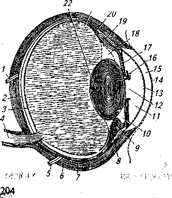 1 — пигментные клетки; 2 — клет- 2 — с ки палочки; 3 — клетки колбочки; 4 — биполярная; 5 — горизонтальная; 6— амакриновая клетка; 7 — большая ганглиозная клетка; 8 — малая ганглиозная клетка; 9 — нервные хрусталика. Собственно сосудистая оболочка расположена между склерой и сетчаткой, ее функция — питание сетчатки. Сетчатая оболочка, рецепторная часть глаза, задняя зрительная часть ретины содержат светочувствительные элементы — фоторецепторы: палочковые и колбочковые нейросенсорные клейки (рис. 93). У большинства млекопитающих палочек в сетчатке больше, чем колбочек. Слепое пятно сетчатки — зрительный сосок, место выхода зрительного нерва, не имеет палочек и колбочек, а желтое пятно сетчатки — место наилучшего видения. Передняя часть глазного яблока и внутренняя поверхность век покрыты слизистой оболочкой — конъюнктивой (место перехода с глаза на веко — свод конъюнктивы). Полость глазного яблока заполнена в передней части камерной жидкостью, хрусталиком, стекловидным телом. Хрусталик расположен позади радужки, имеет вид двояковыпуклой прозрачной линзы. Он состоит из плотного ядра и корковой части (сильно вытянутых клеток эпителия), не содержит сосудов и нервов. Между роговицей и хрусталиком находятся глазные камеры: до радужки передняя, за ней задняя. Камерная жидкость питает ткани глаза, в которых нет кровеносных сосудов, удаляет продукты обмена, проводит лучи света от роговицы к хрусталику. За хрусталиком расположено стекловидное тело — прозрачная коллоидно-студенистая масса. Глаз питается от наружной глазничной артерии (ветвь внутренней челюстной артерии). Иннервация органов зрения осуществляется за счет ветвей III, IV, V, VIчерепных нервов, ядра которых находятся в среднем, заднем и продолговатом мозге. Лимфатических капилляров нет, имеется несколько лимфатических пространств.