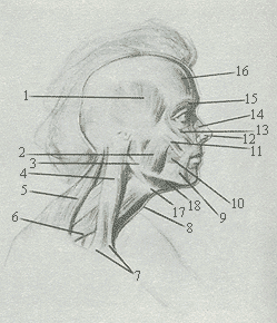 Височная мышца хорошо заметна для глаза во время жевания. Она расположена в височной ямке, крепясь в верхней своей части к височному гребню, а в нижней к венечному отростку нижнечелюстной кости. Ее функция – поднимать нижнечелюстную кость и закрывать рот. Собственно жевательная мышца крепится в верхней своей части к скуловой кости и к скуловой дуге, а внизу к нижнечелюстной кости, заполняя ее угол. Эта мышца так же хорошо просматривается при жевании. Она поднимает нижнечелюстную кость, смыкает зубы. Мимические мышцы при своем сокращении осуществляют то, что мы называем мимикой – отражение эмоционального состояния посредством воздействия на всю кожу лица. Располагаясь в верхней, средней и нижней частях лица, мимические мышцы делятся соответственно на три группы. Прежде всего это лобная мышца. Вверху она крепится к сухожильному шлему, который облегает всю верхнюю часть черепа, а внизу к коже в области бровей, которые она и поднимает вместе с кожей, что является ее функцией. У внутреннего конца бровей, прикрепляясь одним концом к их коже, а другим к кости, бровная мышца сближает брови, образуя вертикальную складку. Покрывая собой глазницу, круговая мышца глаза смыкает глазную щель и спускает брови. Круговая мышца рта плотно смыкает ротовую щель, а вот открывание рта осуществляет большее количество мышц: скуловая мышца, мышца смеха, квадратная мышца верхней губы, квадратная мышца нижней губы, треугольная мышца, мышца трубачей. Характерная особенность мимических мышц – они имеют свойство сокращаться не только самостоятельно, но и совместно с другими, что способствует чрезвычайному богатству пластического выражения эмоций на лице человека: неудовольствие, гнев, презрение, плач, смех, веселье, радость, удовольствие и т. д.