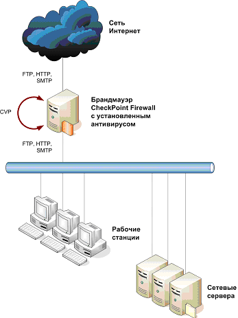 В общем случае антивирус устанавливается на отдельный сервер и принимает от брандмауэра Firewall-1 перенаправленные потоки, проверяет их, и возвращает назад на брандмауэр.