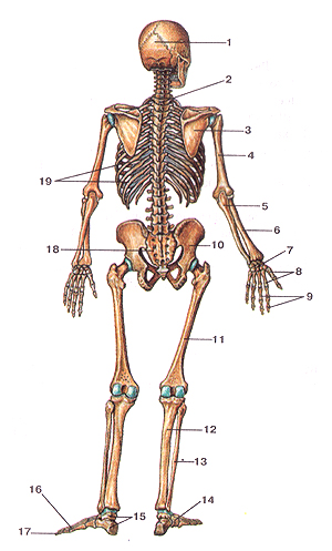 1-череп; 2-позвоночный столб; 3-лопатка; 4-плечевая кость; 5-локтевая кость; 6-лучевая кость; 7-кости запястья; 8-кости пясти; 9-фаланги пальцев кисти; 10-тазовая кость; 11-бедренная кость; 12-большеберцовая кость; 13-малоберцовая кость; 14-кос-ти стопы; 15-кости предплюсны; 16-кости плюсны; 17-фаланги пальцев стопы; 18-крестец; 19-ребра (грудная клетка).