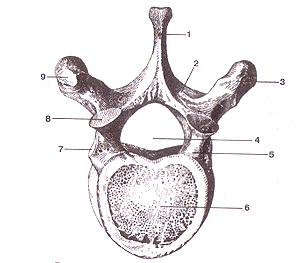 1-spinous process; 2-vertebral arch; 3-transverse process; 4-vertebral foramen; 5-pedicle; 6-vertebra! body; 7-costal facet; 8-superior articular process; 9- transverse costal facet.