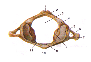 Fig. 6. The first cervical vertebra (atlas). Superior aspect. I-posterior tubercle; 2-posterior arch; 3-yertebral foramen; 4-groove for vertebral artery; 5-transverse foramen; 6- foramen transversarium; 7-transverse process; 8-lateral mass; 9-facet for dens; 10-anterior tubercle; 11-anterior arch.