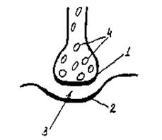 2. Постсинаптическая мембрана (2), находящаяся на теле нейрона или его отротростках, на которые необходимо передать нервный импульс.