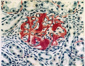 Рис 67. Амилоидоз почки. Амилоид в капиллярных петлях клубочков и под базальной мембраной канальцев. Окраска конго красным.