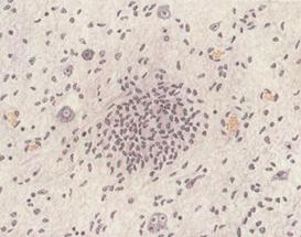 Рис. 96. Сыпнотифозная гранулема Попова. Скопление гистиоцитов и глиальных клеток на месте разрушенного сосуда. \
