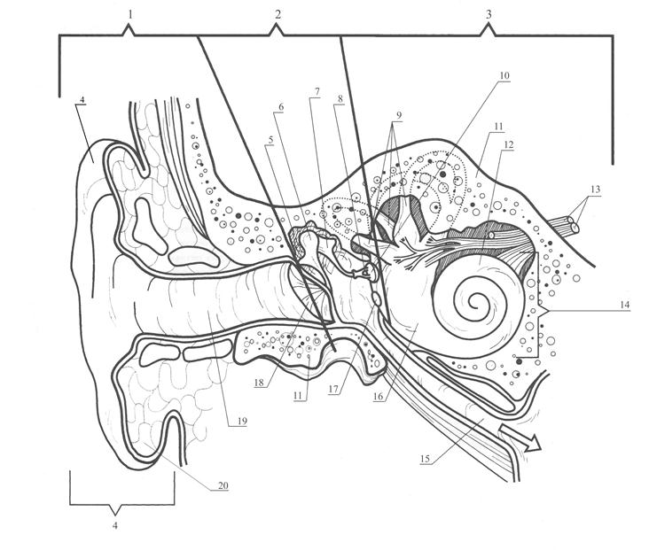Занятие 10 Раздел 4. Органы чувств Предверно-улитковый орган (рис. 30). Ухо – орган слуха и орган равновесия. Системы уха преобразуют колебания воздуха в колебания жидкости, а затем в нервные импульсы, которые обрабатываются в коре головного мозга. Ухо подразделяется на три части: наружное, среднее и внутреннее ухо (рис. 30).