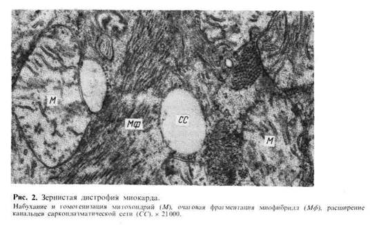 Микроскопическая картина: клетки печени, эпителия извитых канальцев по- чек, мышечных волокон сердца изменяются. Они увеличиваются, набухают, цитоплазма их становится мутной, богатой белковыми гранулами или капля- ми, хорошо выявляемыми гистохимическими методами (реакции Даниелли и Милона) и с помощью электронного микроскопа. Электронно-микроскопи- ческое исследование позволяет выявить в таких случаях набухание или вакуо- лизацию митохондрий (рис. 2), а также расширенные цистерны эндоплазмати- ческой сети, в которых определяются скопления белков; отмечается деструкция мембран.