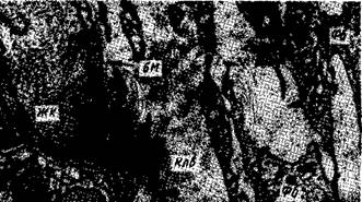 Рис. 290. Постнекротический цирроз печени. а — электрононг рамма: разраста- ние фибробластов (Фб) и кол-» лагеновых волокон (K.лB) между гепатоцитами в результате кол- лапса стромы печени; ЖК— желчный капилляр; БМ — ба- зальная мембрана капилляра, х 14250 (по Штайнеру); б — микроскопическая картина: не- сколько триад в поле соедини- тельной ткани.