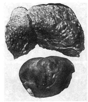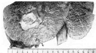 Печень при постнекротическом циррозе плотная, уменьшена в размерах, с крупными узлами, разделенными широкими и глубокими бороздками (крупноузловой или с м е ш а н ы й цирроз) (рис. 291).