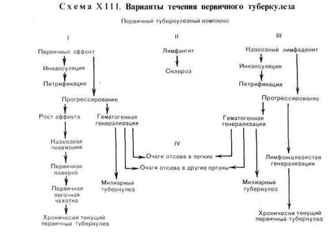 Возможны три варианта течения первичного туберкулеза: 1) затухание первичного туберкулеза и заживление очагов первичного комплекса; 2) про- грессирование первичного туберкулеза с генерализацией процесса; 3) хрониче- ское течение (хронически текущий первичный туберкулез, см. схему XIII).