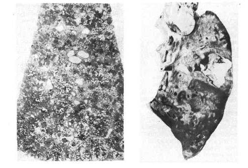 Результаты бактериологических исследований показывают, что в казеозных обызвест- вленных и даже частично оссифицированных массах скапливаются маловирулентные микобакте- рий или их зернистые формы Муха, L-формы микобактерий, которые могут проявлять свою жизнедеятельность при ослаблении защитных сил организма. Это наблюдается у детей после перенесенной кори, гриппа, при истощении на почве рака у взрослых.