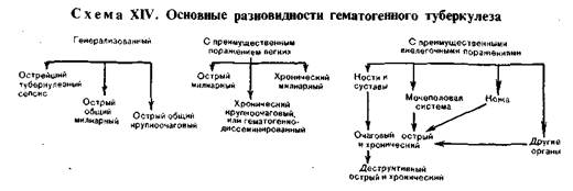 Классификация. Несмотря на все многообразие проявлений гематогенного туберкулеза, все же представляется возможным выделить три его ос- нов н ы е разновидности (схема XIV): 1) генерализованный гемато- генный туберкулез; 2) гематогенный туберкулез с преимущественным пораже- нием легких; 3) гематогенный туберкулез с преимущественными внелегочны- ми поражениями.