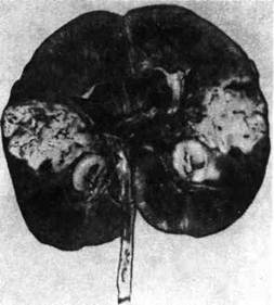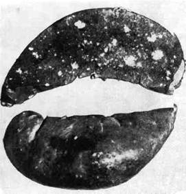 Рис. 341. Изменения селезенки при крупноочаговой генерализации гемато- генного туберкулеза.