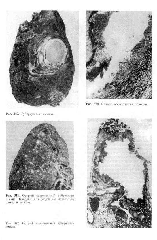 6. Острый кавернозный туберкулез — форма заболевания, для которой характерно быстрое образование полости распада и каверны на ме- сте очага-инфильтрата или туберкулемы (рис. 350). Полость распада возни- кает в результате гнойного расплавления и разжижения казеозных масс, ко- торые с большим числом микобактерий выделяются с мокротой. Это создает большую опасность бронхогенного обсеменения легких, а также выделения микобактерий в окружающую среду.