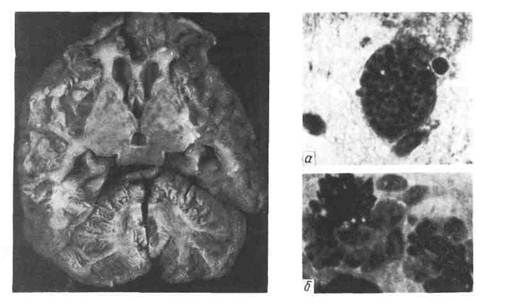 Патологическая анатомия. При врожденном токсоплазмозе, ранней ф е - т о п а т и и изменения в головном мозге имеют характер врожденного порока развития — полушария большого мозга уменьшены (микроцефалия), с многочисленными мелкими кистами, расположенными цепочкой вдоль изви- лин, сохранившаяся мозговая ткань плотная (г л и о з), желтоватая (к а л ь - циноз) (рис. 403). Иногда наблюдается гидроцефалия, при крайней ее сте- пени полушария большого мозга превращаются в два пузыря, наполненные мутной жидкостью. Микроскопически кисты заполнены зернистыми шарами, в сохранившемся между кистами веществе мозга отмечается разрастание во- локнистой нейроглии, пылевидные очаги кальциноза с шаровидными циста- ми. Отмечается микрофтальмия с помутнением хрусталика (катаракта), участки кальциноза в сетчатой и сосудистой оболочках.