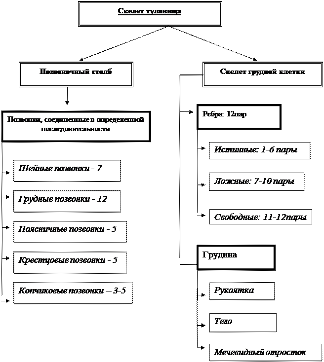 Задание для самоподготовки студентов к практическому занятию. I. Подготовьте тему: «Ткани», в частности соединительную ткань, ее опорно-трофические виды: костную, хрящевую и плотно- волокнистую. II. При изучении скелета туловища найдите ответы на вопросы в предлагаемой последовательности: 1. Дайте определение скелета человека, перечислите функции скелета. 2. Дайте определение кости как органа, объясните ее строение, свойства. 3. Что такое костный мозг, его виды, локализация. 4. Дайте характеристику слоев кости. 5. За счет чего кости растут в длину и толщину. 6. Проведите классификацию костей скелета. 7. Назовите и покажите части трубчатой кости. 8. Назовите и покажите отделы позвоночного столба, определите количество позвонков в каждом из них. 9. Назовите латинское название позвонков, покажите его части. 10. Назовите и покажите основные особенности позвонков: шейного, грудного, поясничного отделов. 11. Расскажите особенности строения 1-го, и 2-го шейных позвонков. 12. Определите на живом человеке остистый отросток 7-го шейного позвонка. 13. Расскажите строение крестца, назовите и покажите его части, поверхности, отверстия. 14. Расскажите классификацию соединений костей 15. Приведите примеры всех видов соединений позвоночного столба. 16. Покажите синартрозные соединения позвонков, назовите их, объясните их функцию. 17. Покажите гемиартрозные соединения (межпозвонковые диски); объясните их значения. 18. Покажите и назовите диартрозные соединения (суставы) позвоночного столба, дайте определение и характеристику. 19. Охарактеризуйте позвоночный столб, как целое; покажите и назовите изгибы, объясните механизм их формирования. 20. Расскажите, в каких суставах и вокруг каких осей происходит движение головы. 21. Расскажите классификацию ребер, назовите и покажите части ребра. 22. Покажите 1-е ребро, назовите ее особенности. 23. Покажите реберную дугу, объясните чем она сформирована. 24. Назовите и покажите части грудины, ее края, вырезки. 25. Пропальпируйте на живом человеке угол грудины, яремную вырезку, мечевидный отросток. 26. Дайте характеристику соединений ребер с грудиной и позвонками. В каких суставах происходит движение при вращении ребер. 27. Покажите подгрудинный угол; объясните чем он образован. Его топографическое значение. 28. Дайте характеристику грудной клетки в целом с учетом конституционных особенностей и возрастных: форма грудной клетки, особенности размеров, величина подгрудинного угла, положение ребер. III. В дневнике для практических работ ответьте на вопросы: