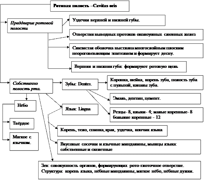 Практическая работа № 8 – 1 Тема: «Морфологические особенности пищеварительной системы; полость рта, глотка, пищевод: структура, функции». Цель занятия: 1. Изучить структуру пищеварительного тракта, внешние особенности, строение стенки, её слоёв. 2. Усвоить топографические и структурные характеристики, лимфоидных и железистых образований пищеварительного тракта. 3. Изучить структуру полости рта, морфологические особенности языка, зубов, миндалин, зева. 4. Сформировать четкие представления о топографии, строении глотки и пищевода. Студент должен знать: 1. Пищеварительный тракт – органы, его формирующие. 2. Принцип строения стенки пищеварительного тракта: особенности строения, связь с внешней средой. 3. Полость рта – преддверие: особенности строения, связь с внешней средой. 4. Полость рта – собственно полость рта: стенки сообщения с глоткой, структура слизистой оболочки; эпителий, её выстилающий. 5. Зев – строение, границы. Небные миндалины и дужки. Миндалины лимфоэпителиального кольца (Пирогова – Вальдейера). 6. Строение языка, его части, вкусовые луковицы. 7. Зубы – строение, виды, зубную формулу, её составление. 8. Глотку – топографию, строение стенки, отделы, отверстия. 9. Пищевод – расположение, строение, стенки, отделы, сужения, кардинальный сфинктер. Микролекция: Пищеварительная система – это совокупность органов, осуществляющих процесс пищеварения. Представлена пищеварительным трактом и пищеварительными железами. Пищеварительный тракт представляет собой не замкнутую, полую, не спадающуюся извитую трубку с расширениями в виде ротовой полости и желудка. В структуре пищеварительного тракта выделяют три этажа пищеварительных органов.