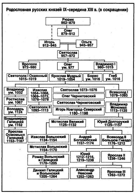 Первые киевские князья (IX — Середина X в.)Объединение Новгорода и Киева. С 862г. Рюрик, согласно «Повести временных лет», утвердился в Новгороде. По традиции с этого времени ведут начало русской государственности. (В 1862 г. в Новгородском кремле был сооружен памятник «Тысячелетие России», скульптор М. О. Микешин.) Некоторые историки считают, что Рюрик был реальной исторической личностью, отождествляя его с Рюриком Фрисландским, который во главе своей дружины неоднократно совершал походы на Западную Европу. Рюрик обосновался в Новгороде, один из его братьев — Синеус — на Белом озере (ныне Белозерск Вологодской обл.), другой — Трувор — в Изборске (неподалеку от Пскова). Историки считают имена «братьев» искажением древнешведских слов: «синеус» — «со своими родами», «трувор» — верная дружина. Это обычно служит одним из доводов против достоверности варяжской легенды. Через два года, согласно летописным сведениям, братья умерли, и Рюрик передал в управление важнейшие города своим мужам. Двое из них, Аскольд и Дир, совершившие неудачный поход на Византию, заняли Киев и освободили киевлян от хазарской дани. После смерти в 879г. Рюрика, не оставившего после себя наследника (по другой версии им был Игорь, что дало основание впоследствии в исторической литературе называть династию киевских князей «Рюриковичами», а Киевскую Русь — «державой Рюриковичей»), власть в Новгороде захватил предводитель одного из варяжских отрядов Олег (879—912). Объединение Киева и Новгорода. Договор Руси с греками. В 882г. Олег предпринял поход на Киев, где в это время княжили Аскольд и Дир (некоторые историки считают этих князей последними представителями рода Кия). Выдав себя за купцов, воины Олега с помощью обмана убили Аскольда и Дира и захватили город. Киев стал центром объединенного государства. Торговым партнером Руси была могущественная Византийская империя. Киевские князья неоднократно совершали походы на своего южного соседа. Так, еще в 860 г. Аскольд и Дир предприняли на этот раз удачный поход на Византию. Еще большую известность получил договор Руси и Византии, заключенный Олегом. В 907 и 911 гг. Олег с войском дважды успешно воевал под стенами Константинополя (Царьграда). В результате этих походов были заключены договоры с греками, составленные, как записал летописец, «надвое харатьи», т. е. в двух экземплярах — на русском и греческом языках. Это подтверждает, что русская письменность появилась задолго до принятия христианства. До появления «Русской Правды» складывалось и законодательство (в договоре с греками упоминалось о «Законе русском», по которому судили жителей Киевской Руси).