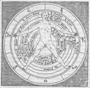 В заключение Филон замечает: «И к тому же дети в утробе матери получают жизнь в конце седьмого месяца, причем происходит в высшей степени удивительная вещь: дети, рожденные в конце седьмого месяца, живут, а все те, кто родился по истечении восьми месяцев, полностью погибают». Во второй части книги «Collectio Operum», посвященной тайнам розенкрейцерской анатомии, Фладд приводит два рисунка, в общих чертах повторяющих иллюстрации Витрувия, на которых отображена взаимосвязь между Макрокосмом и микрокосмом. На первом рисунке (14) показан зодиакальный человек с расставленными в стороны руками и ногами, помещенный внутри большой окружности, представляющей мир, окруженный двойным зодиаком. И хотя текст, сопровождающий этот рисунок, очень краток и малопонятен, его важность не вызывает сомнений. Изображенный на рисунке человек олицетворяет Макрокосм и микрокосм — Великого Человека и Малого Человека — в одном, причем одному соответствует зодиак в левой половине, а другому — зодиак в правой половине. В представлении Фладда, Логос — это зодиакальный человек в развернутой и завершенной форме. Из каждого знака сферы зодиакального колеса выходят лучи, сходящиеся в разных частях человеческой фигуры, которые отображают взаимосвязь между зодиакальными иерархиями и членами и органами тела: Овен связан с головой, глазами, лицом и ушами; Телец — с шеей и гортанью; Близнецы — с плечами, руками и кистями рук; Рак — с легкими, грудной клеткой, молочными железами и ребрами; Лев — с диафрагмой, спиной и боками, сердцем и желудком. [Большинство астрологов связывают желудок с Раком.] К Деве относится брюшная полость и расположенные в ней органы, к Весам — почки, пупок, поясница, пуповина и ягодицы; к Скорпиону — бедра и ноги от бедра до колен; к Козерогу — колени; к Водолею — голени и к Рыбам — ступни. Согласно астроанатомам, знаки зодиака управляют системами человеческого тела, а не какими-то особыми зонами тела. По их мнению, человек представляет собой сложное произведение из двенадцати различных систем, или «малых людей». Таким образом, Овен превращается в человека из костного мозга, Телец — в мышечного человека, Близнецы — в спинномозгового человека, Рак — в человека из симпатических нервов, Лев — в артериального человека, Дева — в усваивающего человека, Весы — в железистого человека, Скорпион — в венозного человека, Стрелец — в человека из двигательных нервов, Козерог — в костного человека, Водолей — в дыхательного человека, а Рыбы — в лимфатического человека. Подобно ученикам древности, эти двенадцать человек собираются вокруг тринадцатой силы — Света Души — и становятся средством распределения души и выражения ее в действии. На втором рисунке (15) Фладда изображен звездный, или астральный, человек — микрокосм — наподобие эмбриона в теле Макрокосма. Только здесь уже планеты, а не знаки зодиака фокусируют на теле свои лучи. Фладд проводит следующие аналогии между планетами и органами тела: Сатурну он приписывает власть над правым ухом, зубами, селезенкой и мочевым пузырем, Юпитеру — над легкими, ребрами, пульсом, спермой и печенью, Марсу — над левым ухом, почками и наружными половыми органами, Солнцу — над правым глазом, головным мозгом и сердцем, Венере — над горлом, печенью, молочными железами, маткой, поясницей и половыми органами, Меркурию — на