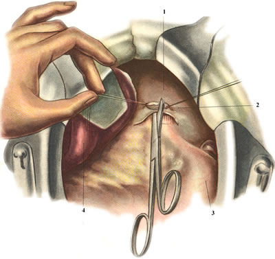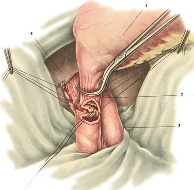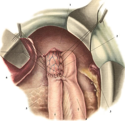 Если после рассечения диафрагмы мобилизация пищевода недостаточна, производят пересечение одной или обеих ножек диафрагмы (круротомия). Во избежание ранения плевры их необходимо пересекать пониже, у тел позвонков. Е. Л. Березов несколько упростил технику диафрагмотомии. Он производит рассечение диафрагмы спереди назад, начиная от сухожильного центра до диафрагмальной вены, а затем, тупо отслоив перикард, рассекает оставшуюся часть диафрагмы вместе с одноименной веной между двумя зажимами. Закончив диафрагмотомию, приступают к выделению абдоминального отдела пищевода и пересечению обоих блуждающих стволов. Мобилизацию желудка, пересечение двенадцатиперстной кишки и обработку культи ее производят так, как описано выше. Следующим этапом операции является наложение пищеводно-кишечного анастомоза.