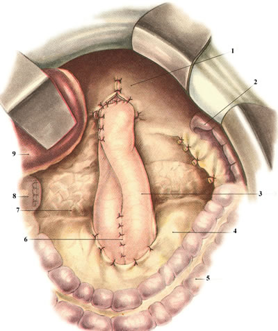 · Вертикальный пищеводно-кишечный анастомоз. Способ Гиляровича—Грэхема (Hilarowiz — Graham). Для наложения анастомоза мобилизованный пищевод пережимают у кардии поперечно зажимом, а желудок выводят в операционную рану, перекидывая его через реберную дугу на грудную клетку. Через отверстие в mеsocolon проводят петлю тощей кишки, приводящий конец которой должен быть около 30— 40 см. По свободному краю отводящего участка кишки у самой вершины петли делают две продольные поверхностные насечки длиной 3 см, отстоящие друг от друга на расстоянии 1,5 см, которые служат ориентиром при наложении боковых швов. Кишку подводят под пищевод, при этом приводящий участок кишки располагается несколько кзади и слева, а отводящий — спереди и справа. Между левым краем пищевода и отводящей петли кишки, соответственно левой насечке, накладывают три шва-держалки на расстоянии 1 см друг от друга. Швы не завязывают, а берут на зажимы; так же накладывают швы с правой стороны пищевода и кишки (рис. 308). После этого кишку приближают к пищеводу и поочередно завязывают все ранее наложенные швы. Затем на уровне нижних боковых швов накладывают ряд поперечных швов между задней стенкой пищевода и кишкой (рис. 309). Отступя на 0,5 см от наложенного шва, рассекают в поперечном направлении переднюю стенку кишки и заднюю стенку пищевода. Перед вскрытием кишки и пищевода брюшную полость тщательно отгораживают салфетками. Задние губы анастомоза сшивают узловыми кетгутовыми швами (рис. 310), а затем приступают к образованию передней стенки анастомоза. Для этого по мере рассечения передней стенки пищевода производят сшивание передних губ анастомоза узловыми кетгутовыми швами (рис. 311). В шов захватывают все слои кишки и пищевода. При этом слизистая оболочка края разреза кишки и пищевода должна полностью погружаться наложенным швом. Желудок после пересечения пищевода удаляют. · · 308. Чрезбрюшинная гастрэктомия. Вертикальный пищеводно-кишечный анастомоз. Способ Гиляровича — Грэхема. Наложение боковых швов. · 1 — ventriculus; 2 — oesophagus (pars abdominalis); 3 — lien; 4 —- тонкая кишка; 5 —- pancreas; 6 — культя duodeni; 7 — lobus hepatis sinister. · · 309. Чрезбрюшинная гастрэктомия. Вертикальный пищеводно-кишечный анастомоз. Способ Гиляровича —Грэхема. Наложение ряда узловых поперечных швов на заднюю стенку анастомоза. · 1 — ventriculus; 2 — oesophagus (pars abdorninalis); 3 — lien; 4 — тонкая кишка; 5 — pancreas; 6 — культя duodeni; 7 —- lobus hepatis sinister. · · 310. Чрезбрюшинная гастрэктомия. Вертикальный пищеводно-кишечный анастомоз. Способ Гиляровича—Грэхема. Наложение ряда узловых швов на задние губы анастомоза. · 1 — ventriculus; 2 — oesophagus (pars abdomi-nalis); 3 — тонкая кишка; 4 — diaphragma. · · 311. Чрезбрюшинная гастрэктомия. Вертикальный пищеводно-кишечный анастомоз. Способ Гиляровича — Грэхема. Поэтапное рассечение передней стенки пищевода и наложение ряда узловых швов на передние губы анастомоза. · 1 — ventriculus; 2 — oesophagus (pars abdominalis); 3 — тонкая кишка; 4 — diaphragma. · Сменив отгораживающие салфетки и инструменты, на переднюю стенку анастомоза накладывают второй ряд узловых серозно-мышечных швов (рис. 312). · · 312. Чрезбрюшинная гастрэктомия. Вертикальный пищеводно-кишечный анастомоз. Способ Гиляровича — Грэхема. Наложение ряда узловых швов на переднюю стенку анастомоза. · 1 — diaphragma; 2 — oesophagus (pars abdominalis); 3 — lien; 4 — тонкая кишка; 5 — pancreas; 6 — lobus hepatis sinister. · Закончив наложение пищеводно-кишечно