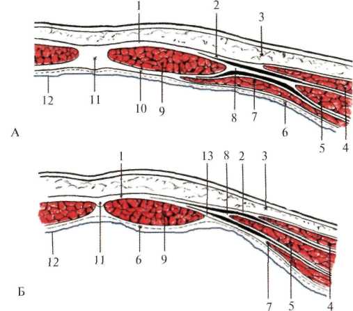 Прямая мышца живота (m. rectus abdominis) представляет собой тяж шириной 8-10 см, разделенный на секции сухожильными перемычками (intersectiones tendineае). Таких перемычек обычно бывает от двух до четырех: две выше пупка, одна на уровне пупка и одна ниже его. Вдоль сухожильных перемычек проходят сосуды и нервы, являющиеся ветвями межреберных сосудов и нервов. Прямая мышца живота заключена во влагалище, образованное апоневрозами всех трех широких мышц живота (рис.1.6, 1.7). Передняя стенка влагалища образована апоневрозом наружной косой мышцы живота и поверхностным листком апоневроза внутренней косой мышцы живота, задняя стенка – глубоким листком апоневроза внутренней косой мышцы и апоневрозом поперечной мышцы живота. Таковое строение влагалище прямой мышцы живота имеет от мечевидного отростка до середины расстояния между пупком и лоном. Начиная от этого уровня все три листка апоневрозов переходят на переднюю поверхность, а задняя стенка влагалища образованна поперечной фасцией.