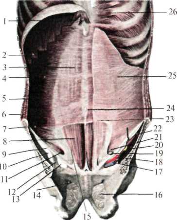Рис. 1.8. Передняя стенка живота сзади (по Синельникову, с изменениями). 1 — diaphragma (pars sternalis); 2 — diaphragma (pars costalis); 3 — vagina m. recti abdominis; 4 — m. transversus abdominis; 5 — m. obliquus intern us abdominis; 6 — m. obliquus externus abdominis; 7 — m. transversus abdominis; 8 — m. rectus abdominis; 9 - lig. inguinale; 10 — lacuna musculorum; 11 — m. cremaster; 12 — arcus iliopectineus; 13 — lacuna vasorum; 14 — canalis obturatorius; 15 — linea Spigelii; 16 — membrana obturatoria; 17 — v. iliaca externa; 18 — a. iliaca externa; 19 — funiculus spermaticus; 20 — n. femoralis; 21 — anulus inguinalis abdominis (profundus); 22 — m. iliopsoas; 23 — linea Douglasi; 24 — fascia umbilicalis; 25 — fascia transversalis; 26 — m. transversus thoracis