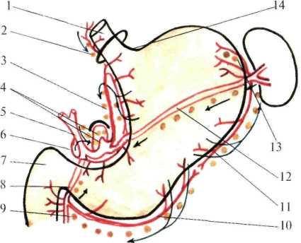 Рис.1.23. Лимфоотгок желудка (схема). 1 — oesophagus; 2 — rami et nodi oesophagei; 3 — a. et nod. gastricae sinistrae; 4 — truncus et nodi coeliaci; 5 — a. et nod. hepaticae; 6 — a. et nod. gastricae dextrae; 7 — duodenum; 8 — a. gastroduodenalis et nod. retropyloricum; 9 — nod. subpyloricum; 10 — a. et nod. gastroomentales dextrae; 11 — a. et nod. gastroomentales sinistrae; 12 — a. et nod. splenici; 13 — a. et nod. gastricae breves; 14 — incisura cardiaca.