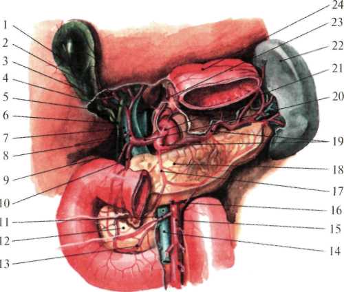 1 — gl. suprarenalis dextra; 2 — ren dexter; 3 — a. et v. pancreaticoduodenalis superior; 4 — duodenum; 5 — papilla duodeni minor; 6 — ductus pancreaticus accessorius; 7 — ductus choledochus; 8 — papilla duodeni major; 9 — a. et v.pancreaticoduodenalis inferior; 10 — v. mesenterica superior; 11 — a. mesenterica superior et plexus mesentericus superior; 12 — ductus pancreaticus; 13 — ren sinister; 14 — ramus pancreaticus (a. splenica); 15 —splen; 16 —nodi lymphoideipancreaticosplenicum; 17— gl. suprarenalis sinistra; 18 — a. splenica et plexus splenicus; 19 — nodi lymphoidei coeliaci; 20 — truncus coeliacus; 21 — plexus coeliacus; 22 — a. gastroduodenalis; 23 — a. hepatica propria; 24 — v. portae; 25 — ductus choledochus.