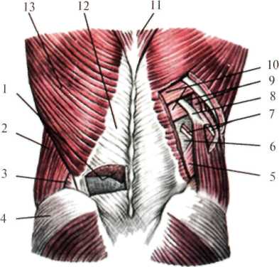 1 – m. erector spinae; 2 – m. obliquus externus abdominis; 3 – trigonum lumbale; 4 – m. gluteus medius; 5 – m. obliquus internus abdominis; 6 – aponeurosis m. transverses abdominis (дно rombus lumbalis); 7 – а.,n. intercostalis; 8 –XII ребро; 9 – mm. intercostales; 10 – m. serratus posterior inferior; 11 – m.trapezius; 12 – fascia thoracolumbalis; 13 – m. latissimus dorsi.