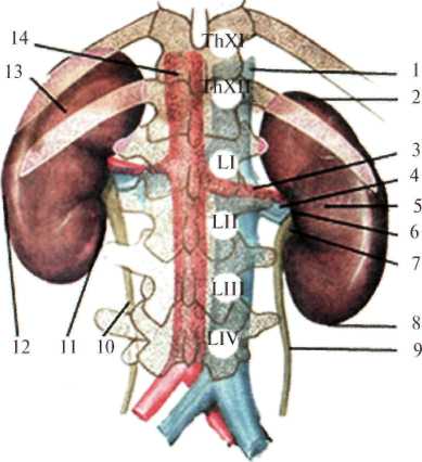 Рис. 2.5 Скелетотопия почки сзади. 1 – v. cava inferior; 2 – extremitas superior; 3 – a. renalis dextra; 4 – v. renalis dextra; 5 – ren dexter; 6 – hylum renale; 7 – pelvis renalis; 8 – extremitas inferior; 9 – ureter dexter; 10 – ureter sinister; 11 – margo medialis; 12 – margo lateralis; 13 – ren sinister; 14 – aorta abdominalis.