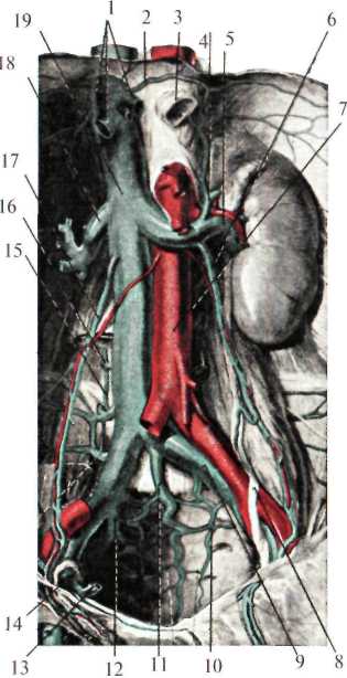 В клетчатке забрюшинного пространства спереди и с боков тел поясничных позвонков расположены: брюшная аорта, нижняя полая вена, восходящие поясничные вены, поясничная часть симпатического ствола и лимфатический проток. Брюшная аорта (aorta abdominalis) на уровне XII грудного позвонка, пройдя через аортальное отверстие диафрагмы (hiatus aorticus diaphragmatis), вступает в забрюшинное пространство, располагаясь несколько левее от средней линии, и на уровне IV поясничного позвонка делится на правую и левую общие подвздошные артерии (рис.2.8). Кпереди от аорты лежит поджелудочная железа, восходящая часть 12-перстной кишки и корень брыжейки тонкой кишки, справа – нижняя полая вена, слева – поясничная часть левого симпатического ствола. От брюшного отдела аорты отходят парные и непарные ветви. Последние берут начало от передней поверхности аорты. К ним относятся: чревный ствол (truncus coeliacus), отходящий от аорты на уровне XII грудного позвонка, верхняя брыжеечная артерия (a. mesenterica superior) – I поясничного позвонка, нижняя брыжеечная артерия (a. mesenterica inferior) – III-IV поясничных позвонков, а также может быть средняя крестцовая артерия (a.sacralis mediana). Парные ветви отходят от боковых стенок аорты: нижние диафрагмальные артерии (aa. phrenicae inferiores), средние надпочечниковые артерии (aa. suprarenales mediae), почечные артерии (aa. renales), яичковая или яичниковая артерии (a. testiculariss, s. ovarica), 4-е пары поясничных артерий (aa. lumbales). Нижняя полая вена (v. cava inferior) образуется за счет слияния общих подвздошных вен (vv. iliacae communes) на уровне IV-V поясничных позвонков, располагается справа от брюшной аорты и через foramen v.cavae проникает в грудную полость (рис.2.9). Снаружи от нее лежит поясничная часть мочеточника. Спереди, на уровне III поясничного позвонка, вену пересекает корень брыжейки тонкой кишки и восходящая часть 12-перстной кишки. Позади нижней полой вены лежит правый симпатический ствол, поясничные артерии и вены (truncus sympaticus dexter, aa. et vv. lumbales) и правая ножка поясничной ножки диафрагмы.