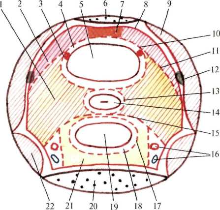 1 — ветви a. circumflexae ilium profundae к m. transversus abdominis; 2, 6 — a. epigastrica inferior; 3 — ветви к m. iliacus; 4 — a. testicularis; 5 — a. cir-cumflexa ilium profunda; 7 — a. obturatoria; 8 — a. umbilicalis; 9 — a. vesicalis superior; 10 — добавочная ветвь к мочевому пузырю; 11 — a. vesicalis inferior; 12 — ductus deferens sinister; 13 — glandula seminalis; 14 — a. rectalis media и ее ветвь a. ductus deferentis; 15 — a. glutea inferior; 16 — a. pudenda interna; 17 — a. sacralis lateralis; 18 — a. glutea superior; 19 — a. iliaca externa; 20 — a. iliaca interna; 21 — a. iliaca communis sinistra; 22 — a. iliaca communis dextra.