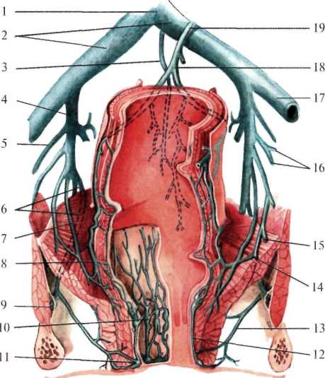 1 — v. cava inferior; 2 — vv. iliacae communes; 3 — v. sacralis mediana; 4 — v. iliaca interna; 5 — v. obturatoria; 6 — v. pudenda interna; 7 — v. rectalis media; 8 — мышечное венозное сплетение; 9 — v. pudenda interna в canalis puden-dals (Alcock); 10 — plexus venosus rectalis internus; 11 — plexus venosus rectalis externus; 12 — анастомоз между наружным и внутренним сплетением; 13 — v. rectalis inferior; 14 — v. vesicalis inferior; 15 — v. vaginalis; 16 — v. vesi-calis superior et v. uterine; 17 — v. iliaca externa; 18 — v. rectalis superior; 19 — v. mesenterica inferior