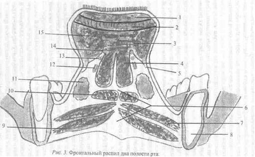 Клетчатка дна полости рта связана (рис.4.15) через передний отросток и выводной проток подчелюстной слюнной железы с ее ложем; по ходу язычной артерии — с влагалищем сосудисто-нервного пучка шеи; путем прямого перехода клетчатки дна полости рта в парафарингеальное пространство. Клетчаточ-ные промежутки дна ротовой полости связаны друг с другом через щели между мышцами.