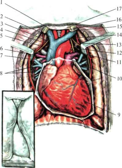 Внеперикардиальная часть в ерхней полой вены представляет собой широкий и короткий ствол длиной 3-4 см. Она образуется на уровне I правого грудино-реберного сочленения, спускается вниз и на высоте II межреберного промежутка входит в полость перикарда. Перед тем как верхняя полая вена покрывается перикардом, она принимает в себя непарную вену, а в последнюю впадает правая верхняя межреберная вена (v. intercostalis superior dextra), образующаяся из слияния трех верхних правых задних межреберных вен. Сзади и слева к внеперикардиальному отделу верхней полой вены прилежит трахея. Справа v. cava superior прилегает к правой средостенной плевре. Между веной и средостенной плеврой проходит п. phrenicus dexter et vasae pericardiacо-phrenici. Слева к верхней полой вене на очень небольшом протяжении прилежит начальная часть дуги аорты (сразу по выходе из полости перикарда). Позади этой части верхней полой вены, в клетчатке проходит правый блуждающий нерв. Дуга аорты (arcus aortae) Является продолжением восходящей аорты. Имеет косое направление справа налево и спереди назад. На уровне IV грудного позвонка перекидывается над левым бронхом, достигает передней поверхности позвоночника и переходит в нисходящую часть аорты. Начальный и конечный отрезки дуги аорты прикрыты реберно-медиастинальными плевральными синусами. От верхней поверхности дуги аорты отходят (справа налево): плечеголовной ствол (truncus brachiocephalicus), левая общая сонная артерия (a. carotis communis sinistra) и левая подключичная артерия (a. subclavia sinistra). В 5-10% случаев от дуги аорты отходит низшая артерия щитовидной железы (a. thyroidea ima), идущая вертикально вверх к перешейку щитовидной железы. Cпереди средний отрезок дуги свободен от плевры, прикрыт вилочковой железой и рыхлой клетчаткой, в которой залегают лимфатические узлы. Спереди и слева ее пересекает левый блуждающий нерв. Здесь он отдает левый возвратный нерв, который огибает дугу аорты снизу и сзади. Кнаружи от блуждающего нерва проходит левый диафрагмальный нерв и vasa pericardiacо-phrenica. Снизу, под дугой аорты, располагается правая легочная артерия. На передненижней поверхности дуги аорты напротив отхождения от ее верхней поверхности левой подключичной артерии находится место прикрепления артериальной связки, lig. arteriosum, представляющей облитерированный артериальный (боталлов [Botallo]) проток. Сзади от дуги аорты лежат трахея, пищевод, грудной (лимфатический) проток, левый возвратный нерв. Снизу и позади дуги аорты справа проходит правая лёгочная артерия по направлению к воротам правого лёгкого. Участок аорты от места отхождения левой подключичной артерии до перехода в нисходящую аорту называется перешейком аорты. Место перехода дуги аорты в нисходящий ее отдел проецируется слева на уровне IV грудного позвонка. В этом месте дуга аорты огибает начальную часть левого бронха спереди назад и справа налево. В окружности дуги аорты и ниже нее расположены аортально-сердечные нервные сплетения, образованные ветвями обоих блуждающих нервов и обоих стволов симпатического нерва. Плечеголовной ствол, truncus brachiocephalics, является первой и самой крупной ветвью дуги аорты. Плечеголовной ствол отходит от аорты примерно по срединной линии и проецируется на рукоятку грудины. Затем он направляется кверху и на уровне правого грудино-ключичного сустава делится на правые подключичную и общую сонную артерии. Вдоль п