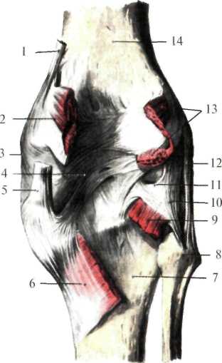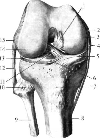 Коленный сустав имеет еще внутренние связки – крестообразные (ligg. cruciata genus). Передняя крестообразная связка (lig. cruciatum anterius) (рис.8.12) проходит между внутренней поверхностью латерального мыщелка бедра и передним межмыщелковым полем большеберцовой кости (area intercondylaris anterior tibiale), задняя крестообразная связка (lig. cruciatum posterius) – между наружной поверхностью медиального мыщелка бедра и задним межмыщелковым полем большеберцовой кости (area intercondylaris posterior tibiale) (рис.13).