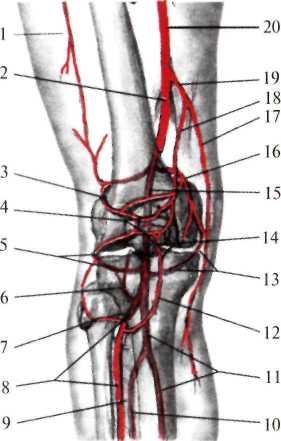 Кровоснабжение коленного сустава происходит за счет многочисленных артерий, образующих коленную суставную сеть (rete articulare genus): нисходящая коленная артерия (a. genus descendens) из бедренной артерии, пять ветвей подколенной артерии: латеральная и медиальная верхние коленные артерии, средняя коленная артерия, латеральная и медиальная нижние коленные артерии (aa. genus superiores medialis et lateralis; a. genus media; aa. genus inferiores medialis et lateralis), возвратные ветви передней большеберцовой артерии: передняя и задняя большеберцовые возвратные артерии (aa. reccurentis tibiales anterior et posterior) и артерия, огибающая малоберцовую кость (r. circumflexus fibulae) – из задней большеберцовой артерии (рис.8.16). Суставная щель проецируется спереди ниже надколенника, тотчас над мыщелками большеберцовой кости, сзади – по кожной поперечной складке подколенной ямки.