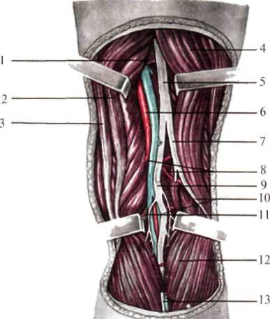 Задняя область (reg. genus posterior). Fossa poplitea, имеет вид ромба и ограниченна мышцами: сверху и снаружи – сухожилием двуглавой мышцы бедра, сверху и изнутри – полусухожильной и полуперепончатой, снизу – двумя головками икроножной мышцы. В нижнелатеральном отделе области можно пальпировать головку малоберцовой кости. Кожа в данной области тонкая, легко смещается. Иннервация ее осуществляется задним кожным нервом бедра. Подкожная клетчатка рыхлая, незначительной толщины. Иногда в ней проходит малая подкожная вена ноги (v. saphena parva), впадающая в подколенную вену (v. poplitea). Тонкий листок поверхностной фасции отделяет клетчатку от собственной фасции (fascia poplitea), являющейся продолжением широкой фасции бедра. Под собственной фасцией в клетчатке находятся крупные сосуды и нервы. В верхнем углу подколенной ямки расположен седалищный нерв, который чаще всего именно на этом уровне делится на общий малоберцовый нерв (n. peroneus communis) и большеберцовый нерв (n. tibialis) (рис.8.17). Общий малоберцовый нерв отклоняется в латеральную сторону и располагается вдоль внутреннего края сухожилия двуглавой мышцы бедра, сразу же под собственной фасцией, причем сухожилие двуглавой мышцы слегка прикрывает нерв сзади. Проекция нерва – линия, соединяющая вершину подколенной ямки с головкой малоберцовой кости. В подколенной ямке от общего малоберцового нерва отходит латеральный кожный нерв икры (n. cutaneus surae lateralis). Большеберцовый нерв сохраняет направление седалищного нерва и идет от верхнего угла подколенной ямки к нижнему вместе с подколенной артерией (a. poplitea) и веной. Проецируется сосудисто-нервный пучок по линии, проведенной вертикально через середину подколенной ямки. Большеберцовый нерв расположен поверхностно. Кнутри от него и глубже лежит вена, а еще глубже и кнутри – артерия. В подколенной ямке от большеберцового нерва отходит медиальный нерв икры (n. cutaneus surae medialis), который идет на голень, располагаясь поверхностно между головками икроножной мышцы. Подколенная вена - продолжение глубокой вены задней поверхности голени – задней большеберцовой вены (v. tibialis posterior). В подколенную вену впадает малая подкожная вена, которая в подколенной ямке чаще располагается глубже собственной фасции. Подколенная артерия, являющаяся продолжением бедренной, попадает в подколенную ямку через сухожильную щель большой приводящей мышцы (hiatus tendineus adductorius) из канала приводящих мышц. От нее, кроме мышечных ветвей, отходят артерии к коленному суставу: верхние медиальная и латеральная коленные – выше мыщелков бедра, средняя коленная – входит в толщу крестообразных связок, нижние медиальная и латеральная коленные – проходят под головками икроножной мышцы. Подколенная артерия прилежит близко к бедренной и особенно большеберцовой костям. От бедренной кости ее отделяет небольшой слой (0,5 см) жировой клетчатки. При надмыщелковых переломах бедренной кости верхний отломок смещается кнутри (действие приводящих мышц), а нижний отломок тягой икроножной мышцы смещается кзади и может травмировать стенку лежащей здесь подколенной артерии с последующим образованием тромба и некрозом конечности.
